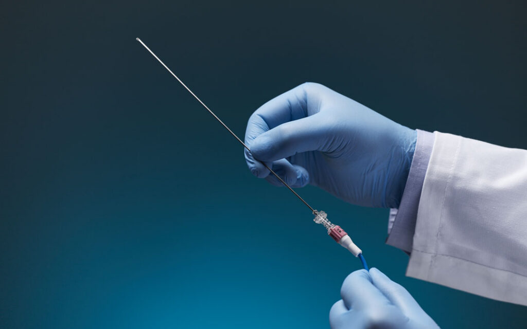 An 18-gauge or 21-gauge needle with an integrated 5DOF sensor in the stylet tip, to simulate tip-tracking for development evaluation of tip position measurement.